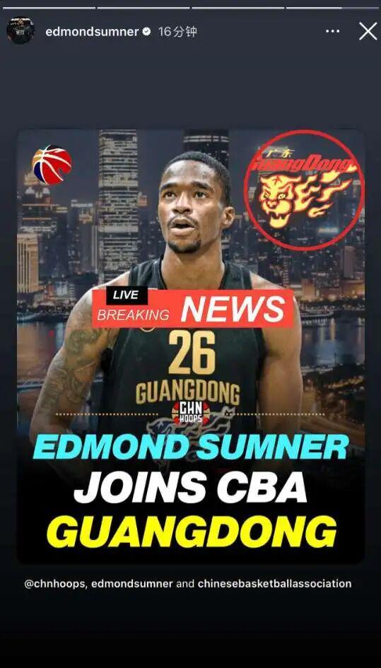 萨姆纳个人社媒更新,转发了自己将加盟广东男篮的爆料消息。不过,这条消息很快被删除。